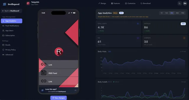 Build your app with Swiftspeed and get built-in analytics from day one. Track installs, visits, sessions, and engagement across iOS, Android, and PWA.